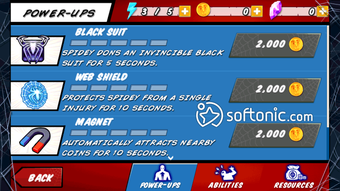Du kan tjäna/köpa spelvaluta i Spider-Man Ultimate Power som kan användas för att uppgradera Spideys krafter, använda boostar eller låsa upp olika dräkter att bära.